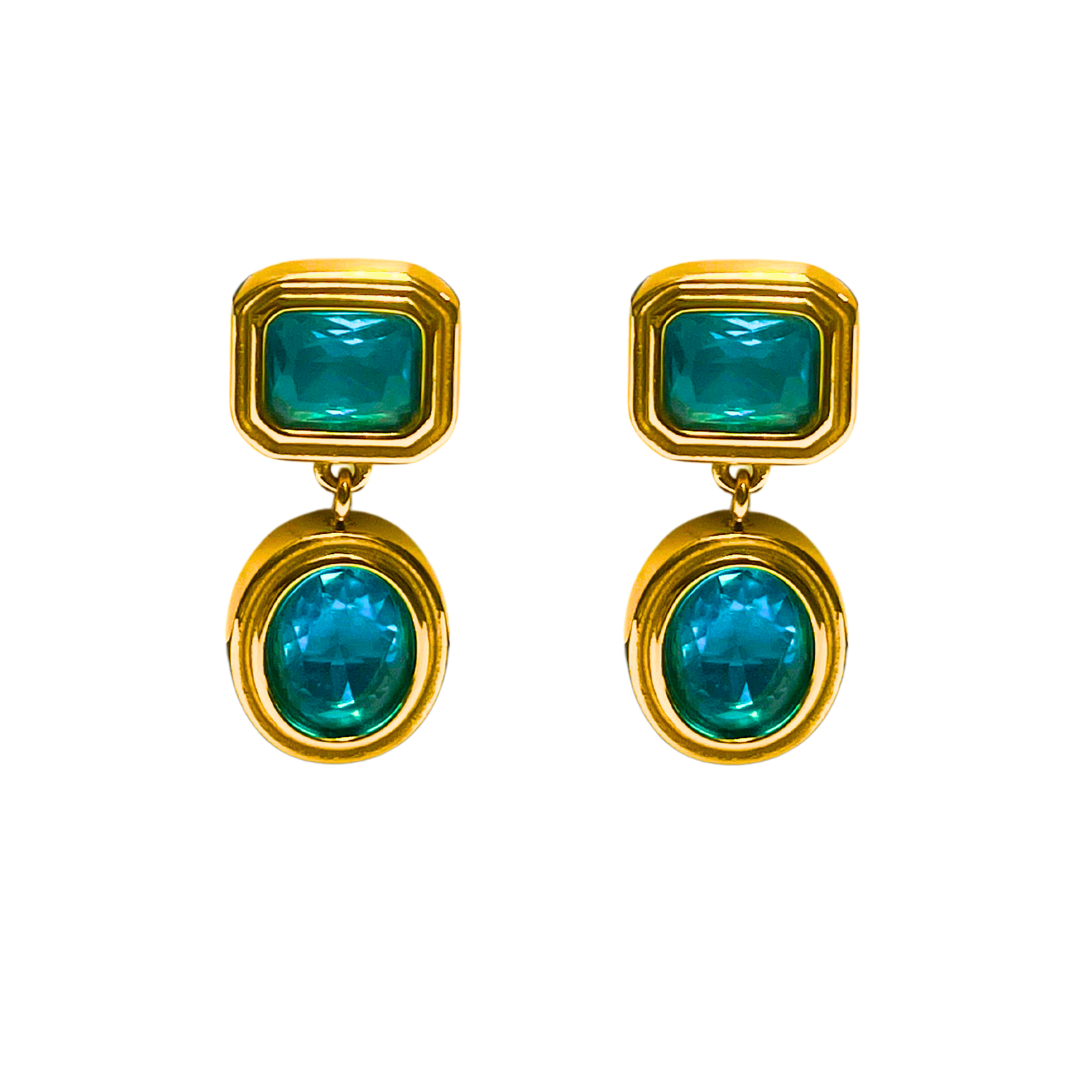 A love letter to the French Riviera. The Côte d’Azur Earrings capture the glamor of vintage jet-set style with bold, aquamarine stones set in rich, gold-plated frames. The rectangular top stud and oval drop create a striking silhouette that sways with movement, catching the light like sun dancing on Mediterranean waves. These earrings feel like a seaside escape — effortlessly chic, endlessly wearable, and impossible to ignore.