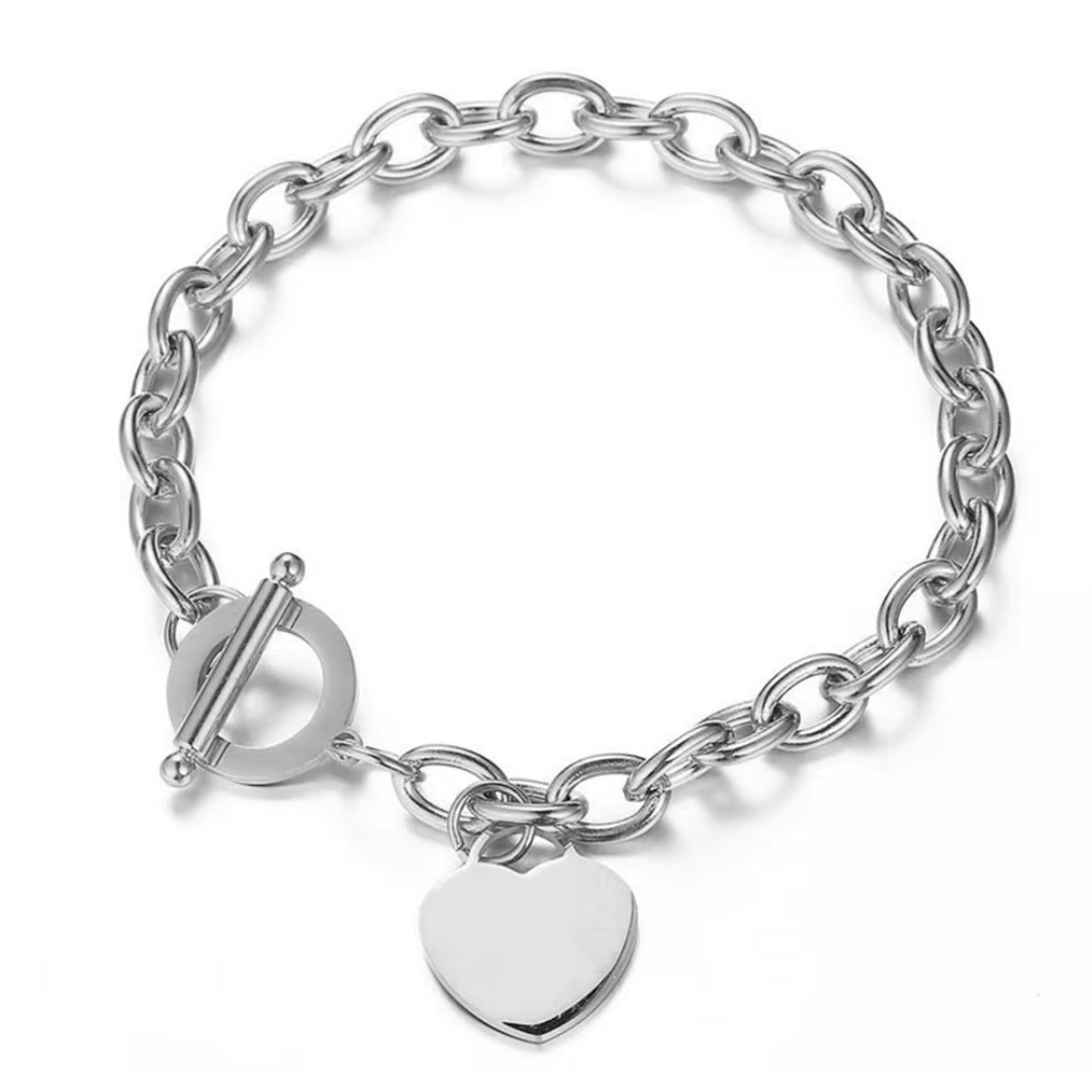 Crafted in shining white gold, this elegant bracelet features a sturdy chain and a heart pendant. Perfect for adding a touch of love and sophistication to any outfit, this bracelet is a must-have for any jewelry collection. Treat yourself or someone special to this timeless piece.